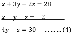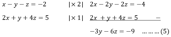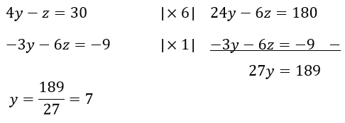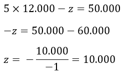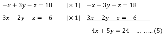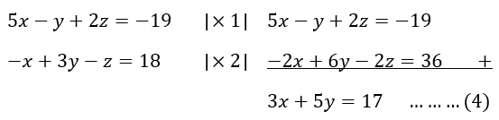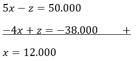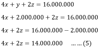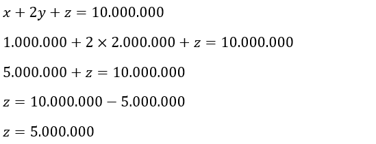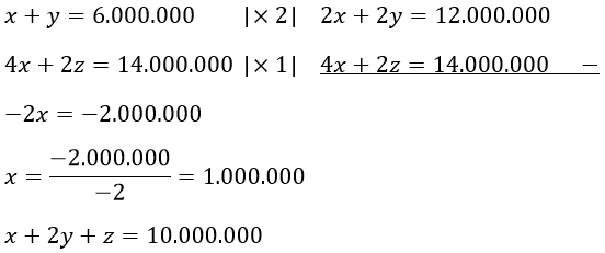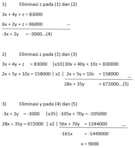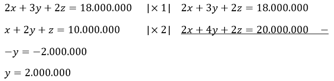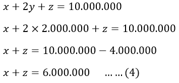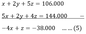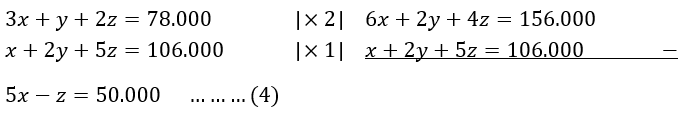 - Eliminasi variabel lainnya dari SPLDV sebelumnya, yaitu z, sehingga diperoleh nilai variabel kedua.