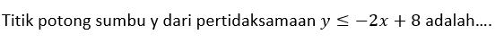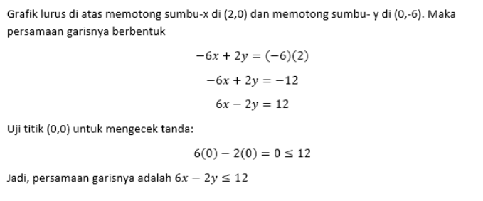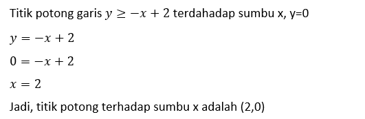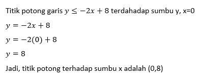 - Uji titik yang berada di sebelah kanan atau kiri garis, kemudian substitusi titik koordinat (x,y) pada pertidaksamaan sehigga menghasilkan pernyataan