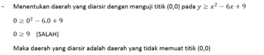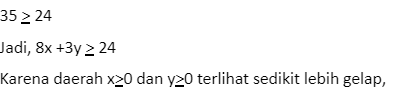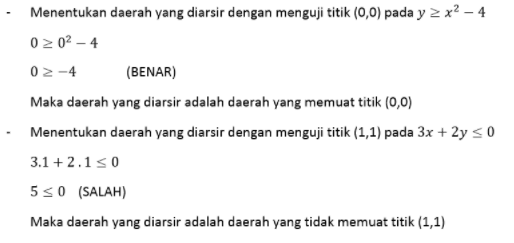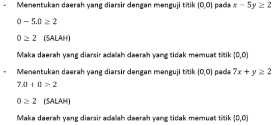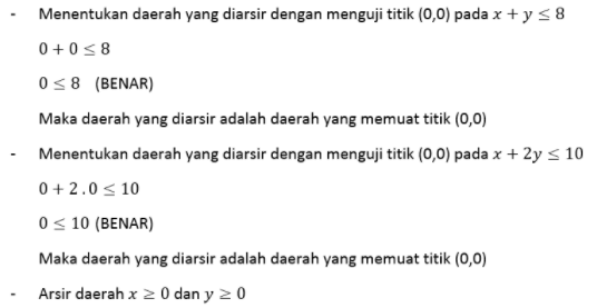 - Lakukan pengujian kebenaran dengan memilih titik uji di dalam daerah penyelesaian tersebut