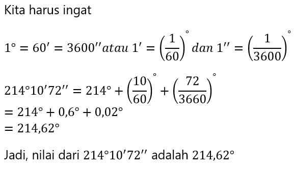 Nilai dari 214º10'72''ke dalam bentuk derajat adalah….