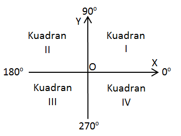 Gambar diatas merupakan pembagian kuadran pada koordinat cartesius berdasarkan sudut pada satu putaran penuh lingkaran.