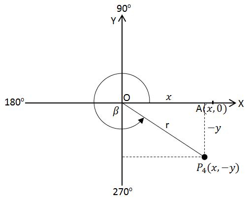Titik P4 (x,-y) terletak di kuadran IV, membentuk sudut AOP4 sebesar ß.