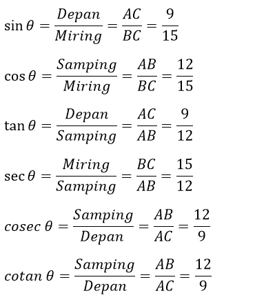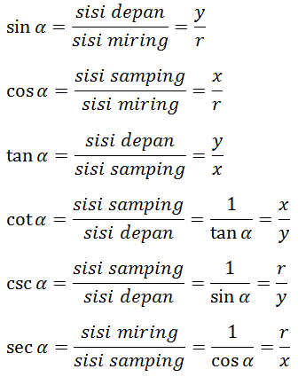 Setelah mengetahui panjang ketiga sisinya, selanjutnya kita akan membahas mengenai definisi sinus, cosinus, tangen, cotangen, secan, dan cosecan.