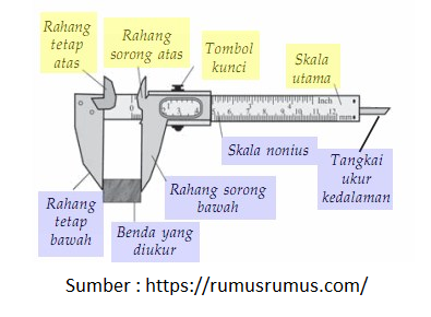 - Rahang geser yang dilengkapi skala nonius. Skala tetap dan nonius mempunyai selisih 1 mm.