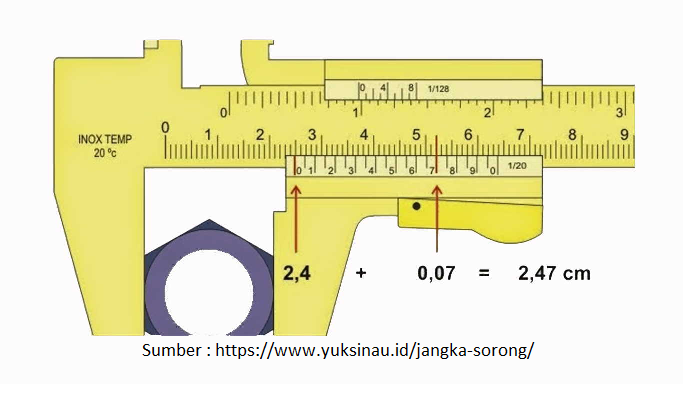 - Jadi, diameter benda itu adalah 2,4 cm + 0,07 mm = 2,47 cm.