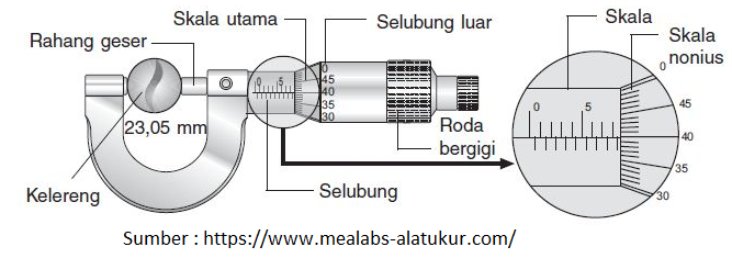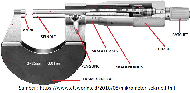Bagian-bagian dari mikrometer adalah rahang putar, skala utama, skala putar, dan silinder bergerigi. Skala terkecil dari skala utama bernilai 0,1 mm, sedangkan skala terkecil untuk skala putar sebesar 0,01 mm. Berikut ini gambar bagian-bagian dari mikrometer.