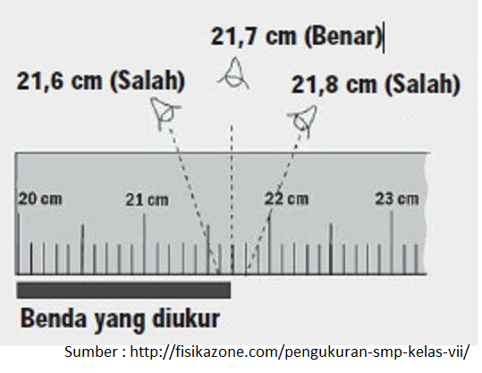 Posisi mata harus melihat tegak lurus terhadap skala ketika membaca skala mistar. Hal ini untuk menghindari kesalahan pembacaan hasil pengukuran akibat beda sudut kemiringan dalam melihat atau disebut dengan kesalahan paralaks.
