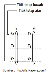 Misalnya, kita akan menentukan skala termometer X dan Y. Termometer X dengan titik tetap bawah Xb dan titik tetap atas Xa. Termometer Y dengan titik tetap bawah Yb dan titik tetap atas Ya. Titik tetap bawah dan titik tetap atas kedua termometer di atas adalah suhu saat es melebur dan suhu saat air mendidih pada tekanan 1 atmosfer.
