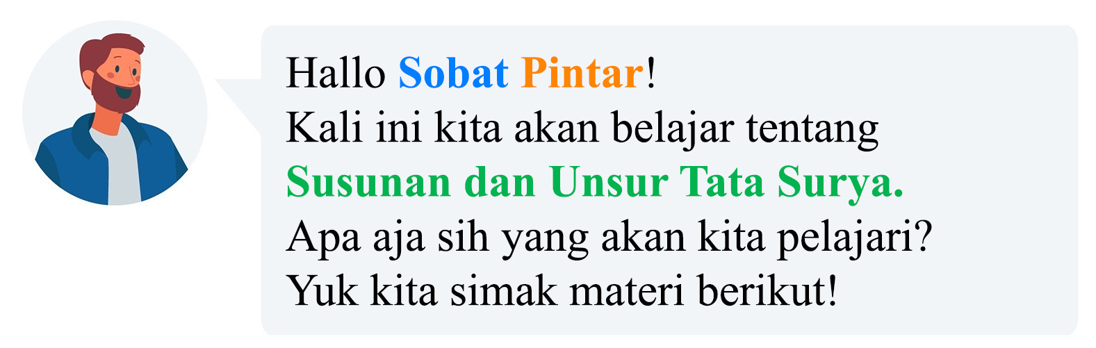 Satu tata surya terdiri atas satu matahari dan benda-benda angkasa yang beredar mengelilinginya. Tata surya kita dikelilingi sembilan planet-planet termasuk planet bumi yang kita tempati ini. Planet dalam, yaitu planet yang lintasannya di antara Bumi dan Matahari, yaitu planet Merkurius dan planet Venus. Planet luar, yaitu planet yang lintasannya mengelilingi matahari lebih jauh dari Bumi, yaitu planet Mars, Yupiter, Saturnus, Uranus, Neptunus.