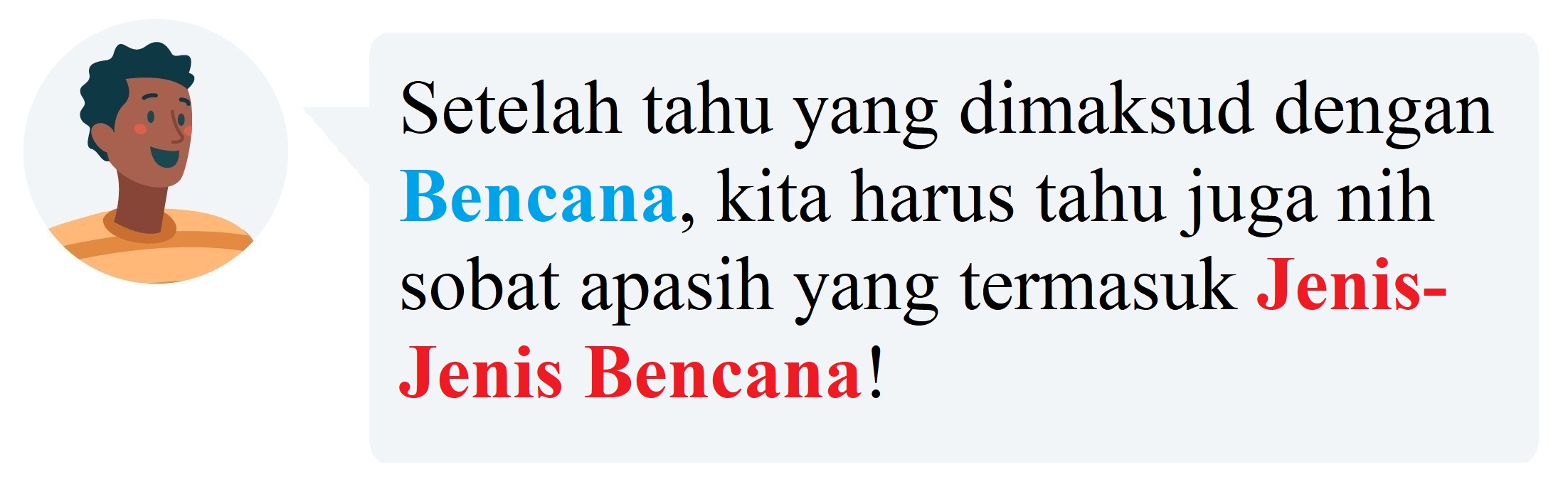 Wilayah Negara Kesatuan Republik Indonesia secara geografis terletak di antara Benua Asia dan Benua Australia, Samudra Pasifik dan Samudra Hindia, pertemuan Pegunungan Sirkum Pasifik dan Sirkum Mediterania serta pertemuan tiga lempeng aktif yaitu Lempeng Pasifik, Indo-Australia dan Eurasia. Posisi inilah yang menyebabkan wilayah Indonesia berpotensi tinggi terjadi bencana. Tahukah sobat apa yang dimaksud dengan bencana? dan apa saja jenis-jenis bencana? Yuk kita bahas!