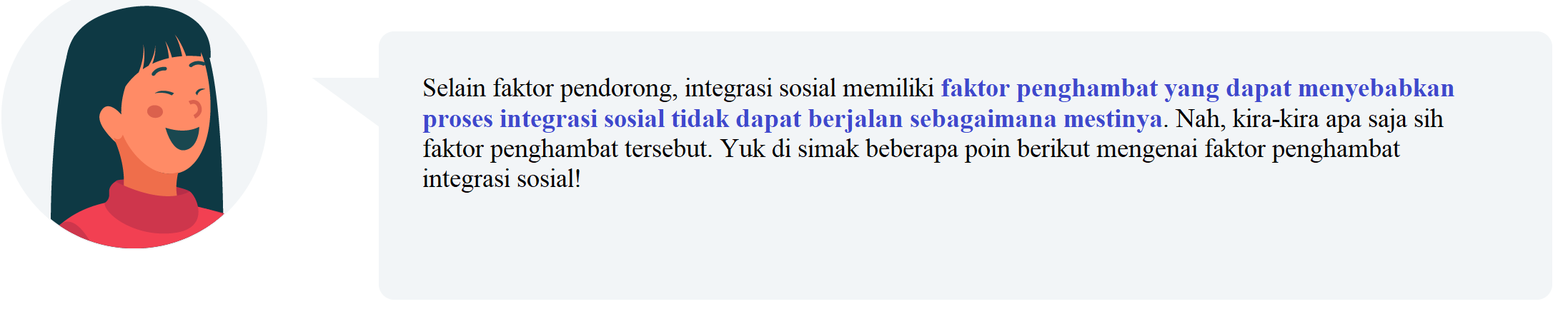 Selain faktor pendorong, dalam proses menciptakan integrasi sosial juga memiliki beberapa faktor penghambat, diantaranya;