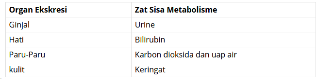 Berikut organ ekskresi dan zat sisa metabolisme yang dikeluarkan: