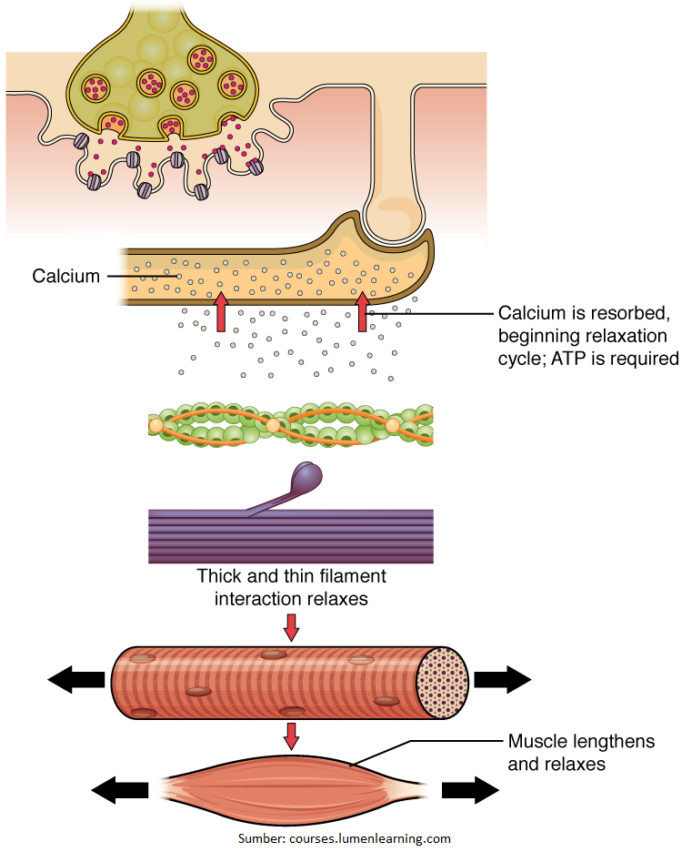 Setelah otot lelah atau selesa berkontraksi, selanjutnya akan mengalami relaksasi akan mengalami relaksasi ketika sinyal gerak dari neuron motorik berakhir atau otot kehabisan sumber ATP, berikut proses saat otot berelaksasi: