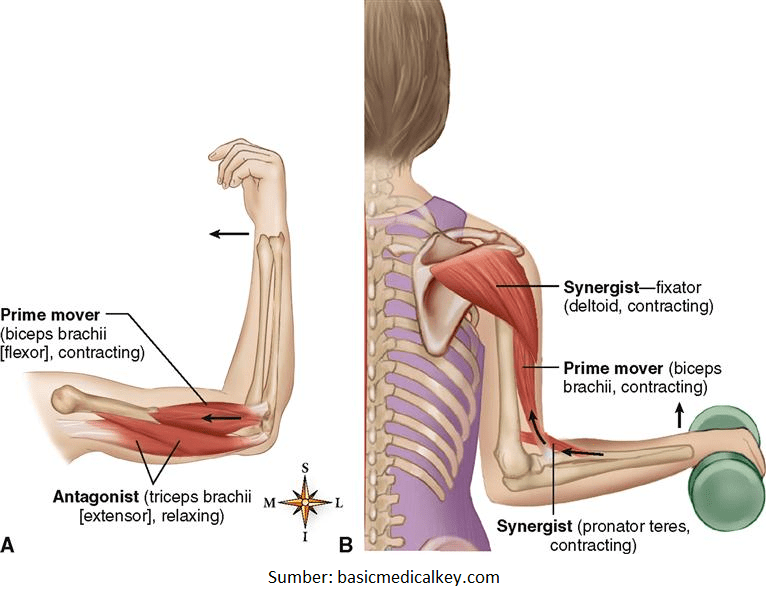 A. sinergis yakni otot biseps berkontraksi, trisep relaksasi