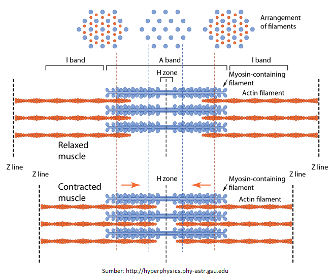 Dari gambar di atas, Sobat Pintar bisa temukan Zona H , Pita I, Pita A, dan Garis Z. Ketika kontraksi, Pita Z akan saling mendekat sehingga Pita I dan Zona H ikut memendek sedangkan Pita A tetap pada posisi.