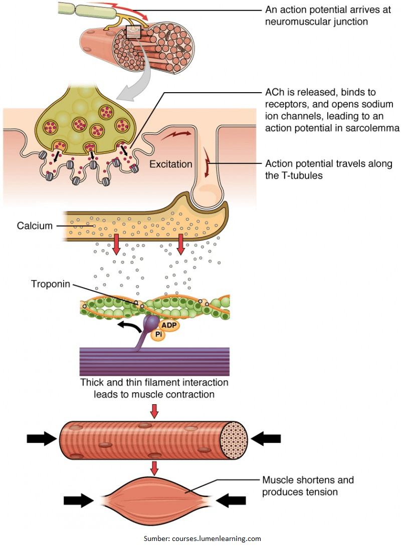Otot bekerja dengan melakukan kontraksi dan relaksasi, komponen yang berperan dalam proses ini adalah protein troponin yang ada di dalam filamen aktin. Berikut tahapan kontraksi otot: