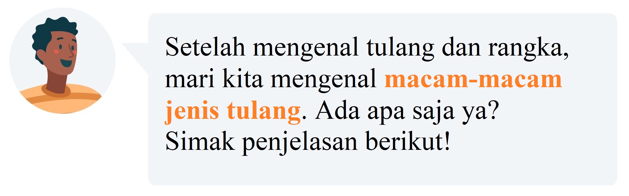 Seperti telah Sobat Pintar ketahui, tulang dibagi menjadi dua kelompok, yaitu tulang rawan (kartilago) dan tulang sejati (osteon). Pembagian jenis tulang tersebut berdasarkan susunan jaringan dan sifat-sifat atau ciri-ciri yang dimilikinya.