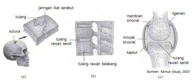 Hubungan antar tulang, yaitu (a) sinartrosis, (b) amfiartrosis, dan (c) diartrosis