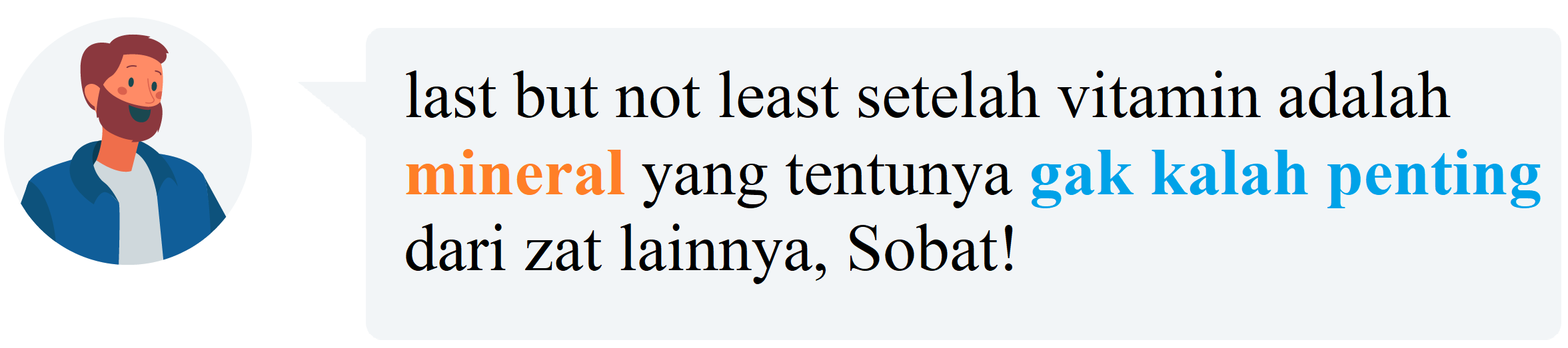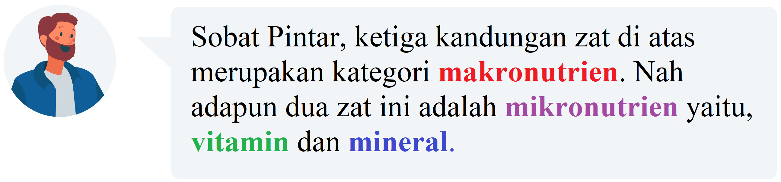 - Mineral makro, yang merupakan golongan mineral yang diperlukan tubuh dalam jumlah lebih banyak, seperti Natrium, Clorida, Kalium, Kalsium, Magnesium, Fosfor dan Sulfur.