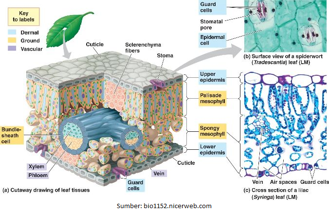 Pada epidermis terdapat hubungan yang putus-putus oleh suatu lubang yang sangat kecil. Bagian tersebut adalah ruang antarsel yang dibatasi oleh dua sel khusus yang disebut sel penjaga. Sel penjaga bersama-sama membentuk stroma. Jadi, stomata terdiri atas sel penutup yang berkloroplas, sel yang tidak berkloroplas, dan celah stomata.