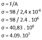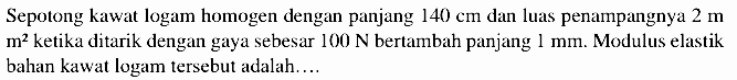 Sebuah balok 10 kg dikaitkan pada sebuah kawat yang memiliki luas penampang 2,4 mm2. Jika g = 9,8 m/s2, tegangan yang dialami kawat tersebut adalah..... Nm-2