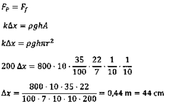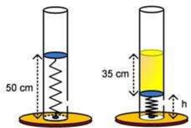 Suatu zat cair dengan massa jenis 800 kg/m^3 kemudian dimasukkan ke dalam pipa hingga setinggi 35 cm. Pegas tertekan ke bawah hingga posisinya setinggi h. Jika konstanta pegas adalah 200 N/m dan percepatan gravitasi 10 m/s^2. tentukan nilai h!
