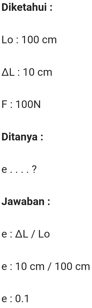 Pegas dengan panjang 100 cm diberikan gaya sebesar 100 Newton sehingga mengalami pertambahan panjang sebanyak 10 cm. Berapa besar regangan pegas tersebut?