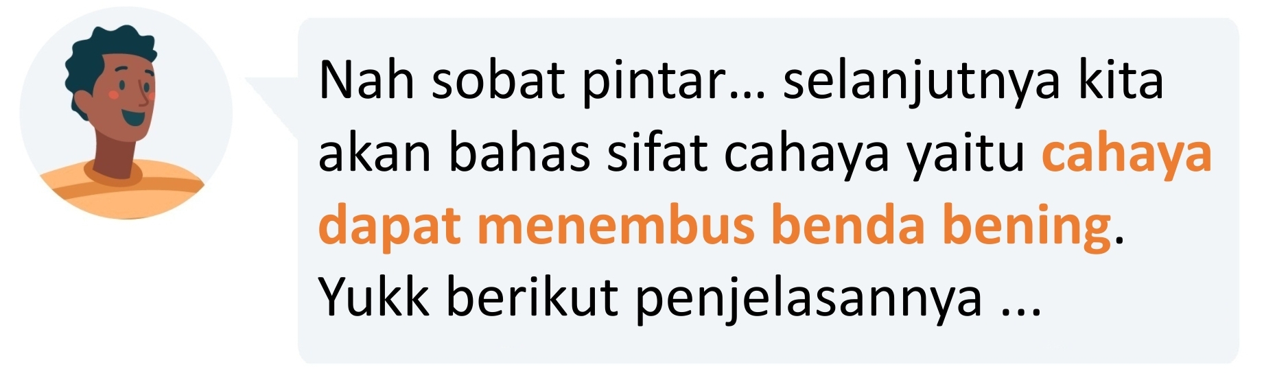 - Benda bening atau transparan (dapat meneruskan semua cahaya)