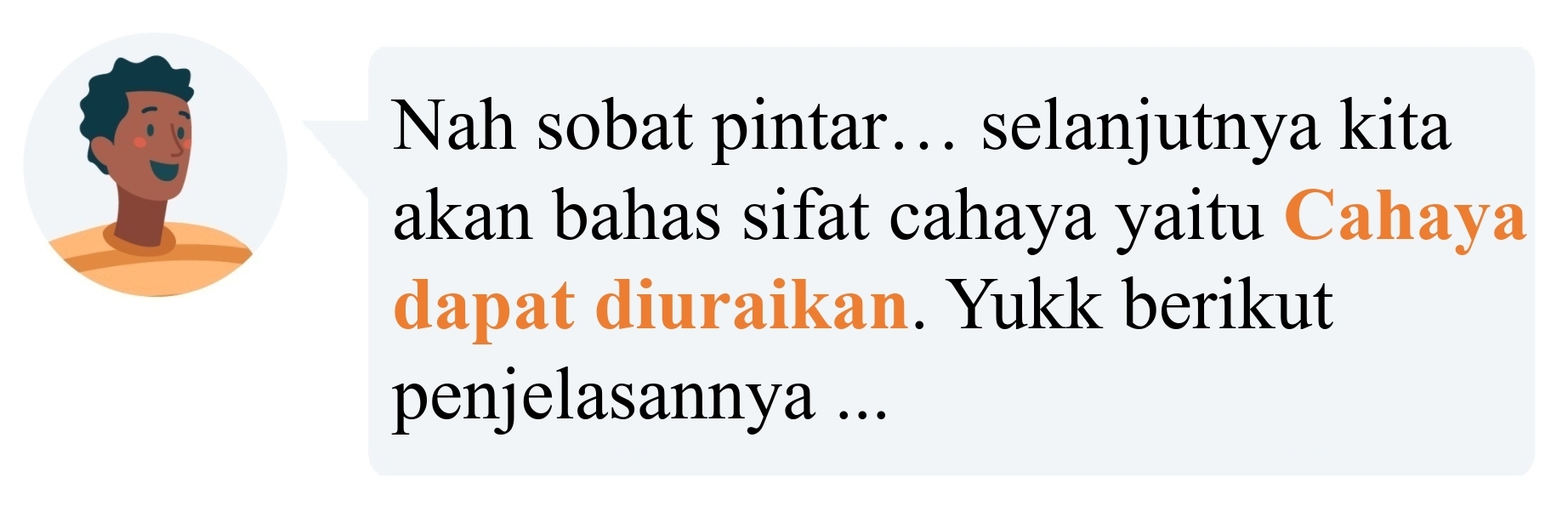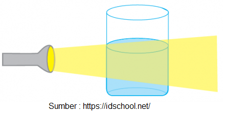 - Benda Translusens (hanya dapat meneruskan sebagian cahaya yang diterimanya, contohnya air keruh, kaca dop, dll)