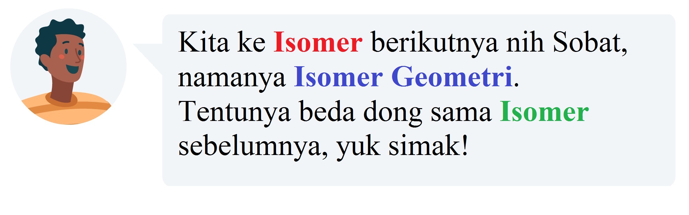 Yaitu senyawa yang memiliki rumus molekul sama tetapi secara keruangan memiliki posisi yang berbeda. Senyawa yang memiliki isomer geometri terjadi hanya pada alkena.