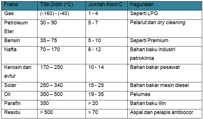 Sobat pintar, dibawah ini merupakan tabel dari fraksi-fraksi minyak bumi: