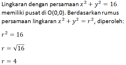 Sebuah lingkaran memiliki persamaan x2+y2=16, jari-jari lingkaran tersebut adalah ....