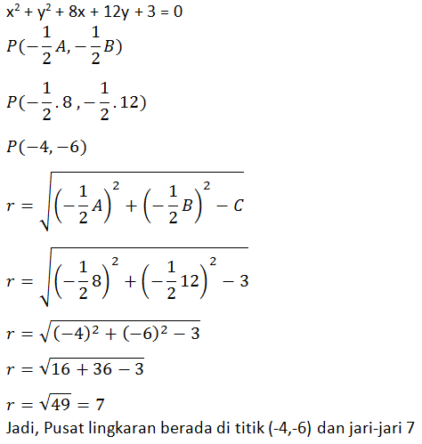 Sebuah lingkaran memiliki persamaan x2 + y2 + 8x + 12y + 3 = 0, pusat dan jari-jari lingkaran tersebut berturut-turut adalah ....