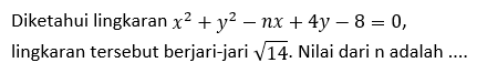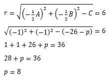 Diketahui lingkaran x2 + y2 + 2x + 2y – 26 – p = 0, lingkaran tersebut berjari-jari 6. Nilai p adalah ....