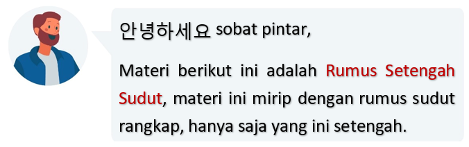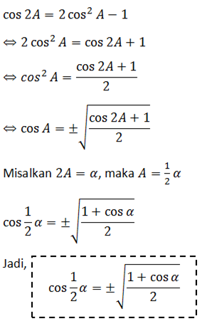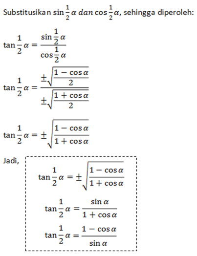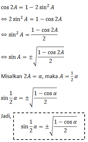 Sebelumnya ada rumus sudut rangkap alias dua kali lipat, kenapa tidak dibahas juga rumus setengah sudut, lawannya dari sudut rangkap. Berikut rumus-rumusnya yaa sobat