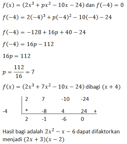 Salah satu faktor dari (2x3 + px2 - 10x - 24) adalah (x+4). Faktor-faktor lainnya adalah ....
