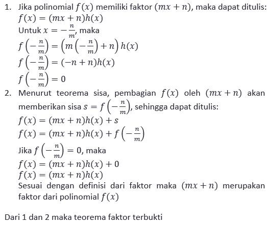 Suatu polinomial f(x) memiliki faktor (mx+n) jika dan hanya jika f(–n/m)=0