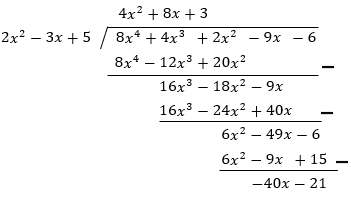 Hasil bagi polinomial 8x4+4x3+2x2-9x-6 oleh (2x2-3x+5) adalah ....