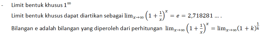 Limit suatu fungsi y = f(x) merupakan nilai yang didekati oleh fungsi tersebut jika x mendekati nilai tertentu. Jadi nilai limit bukan nilai sebenarnya, hanya nilai pendekatan saja.