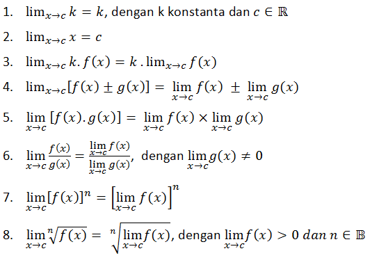 Berdasarkan penjabaran dari konsep limit fungsi, diperoleh sifat-sifat limit fungsi, yaitu: