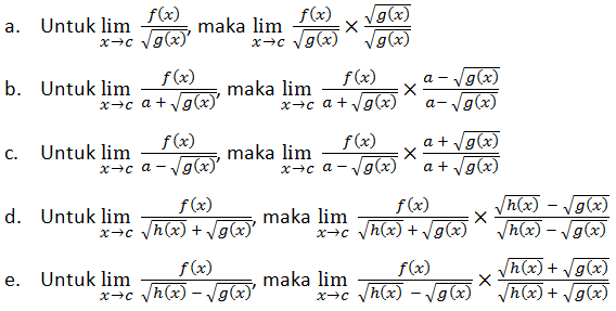 Beberapa cara merasionalkan fungsi untuk menentukan nilai limitnya, yaitu: