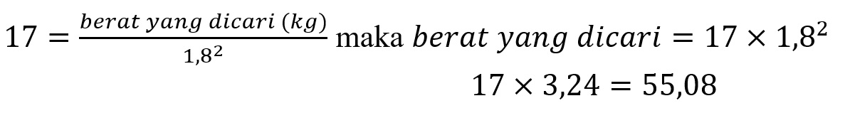 Pada soal dikatakan ada seorang wanita dengan berat badan 60 kilogram dan tinggi 180 cm. maka akan didapatkan perhitungan BMI seperti berikut,