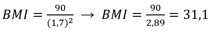 Pada soal dikatakan ada seorang pria dengan berat badan 90 kilogram dan tinggi 170 cm. maka akan didapatkan perhitungan BMI seperti berikut,