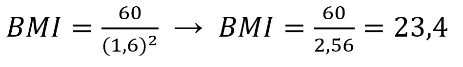 Pada soal dikatakan ada seorang wanita dengan berat badan 60 kilogram dan tinggi 160 cm. maka akan didapatkan perhitungan BMI seperti berikut,