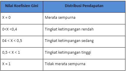Koefisien gini adalah ukuran ketimpangan atau ketidakmerataan pendapatan suatu negara. Angka koefisien gini berkisar antara 0-1. Semakin kecil koefisien gini, semakin merata distribusi pendapatannya. Semakin besar koefisien gini atau mendekati 1, semakin tidak merata pendapatannya.