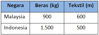Berikut ini disajikan contoh produktivitas seorang pekerja di Malaysia dan Indonesia dalam memproduksi tekstil dan beras.