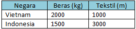 Vietnam akan mengekspor beras ke Indonesia dan mengimpor tekstil dari Indonesia, Indonesia akan mengekspor tekstil ke Vietnam dan mengimpor beras dari Vietnam.
