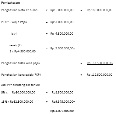 Abyan seorang manajer di perusahaan konstruksi. Penghasilannya Rp15.000.000,00 sebulan. Abyan sudah menikah dan mempunya dua anak. Istrinya tidak bekerja, berapa pajak terutang Abyan tiap tahun ….