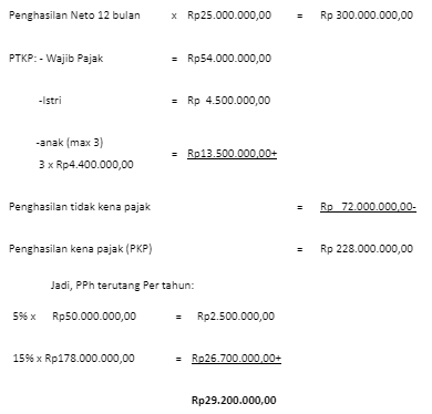 Penghitungan pajak yang terutang untuk Wajib Pajak orang pribadi, Jumlah Penghasilan Kena Pajak Rp525.000.000,00. Maka Pajak Penghasilan yang terutang: