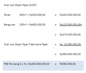 Tuan Aldi memiliki objek pajak yang berkaitan dengan tanah dan bangunan: Tanah seluas 500 m2 dengan nilai Jualnya Rp500.000,00 per m2, rumah seluas 200 m2 dengan nilai jualnya Rp600.000,00 per m2. Hitunglah besarnya PBB yang terutang jika diketahui besarnya NJOPTKP Rp10.000.000,00 dan tarif yang dikenakan sebesar 0,1%.